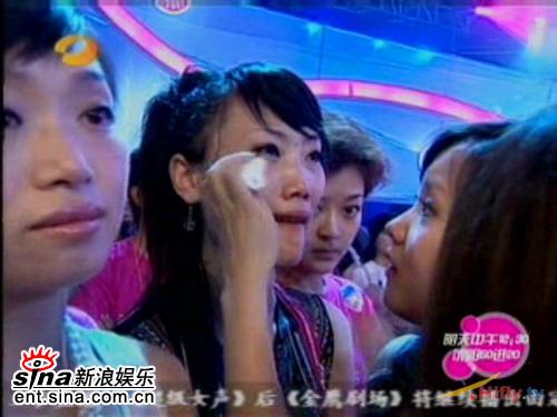 新浪娱乐讯 2006年6月30日星期五,湖南卫视现场直播2006快乐中国超级女声成都唱区7进5晋级赛,新浪娱乐正在全程视频图文直播本场比赛,成都7强01号阳蕾、02号刘悦、03号谭维维、04号熊文、07号赵媛媛、08号乔维怡、09号彭春霞将角逐成都5强。金鹰网授权新浪娱乐视频直播。图为乔维怡泪不成声 好姐妹帮着擦拭眼泪。