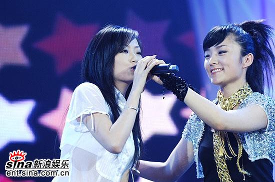 新浪娱乐讯 今晚(7月7日星期五晚),湖南卫视现场直播2006快乐中国超级女声成都唱区5进3晋级赛,新浪娱乐全程视频图文直播,成都5强01号阳蕾、03号谭维维、04号熊文、07号赵媛媛、09号彭春霞角逐超女成都3强。图为张靓颖话筒出问题,与赵媛媛共享一个麦克风。 王建庆/图