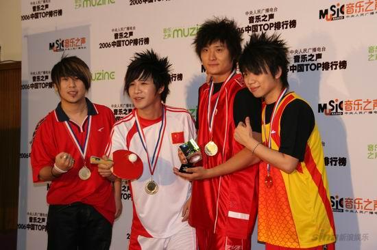 图文:花儿乐队搞怪出场 手捧奖杯挂“金牌”
