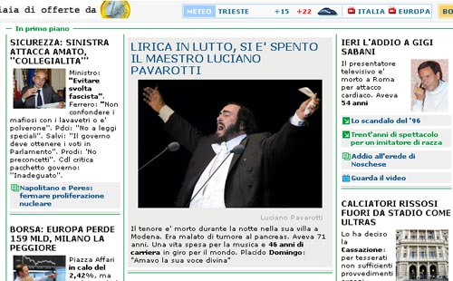 图文:各国新闻网站关注帕瓦罗蒂-安莎通讯社 新浪音乐 2007.09.0616:03 关注 新浪娱乐讯 男高音歌唱家卢恰诺-帕瓦罗蒂因胰腺癌于9月6日上午病逝。世界各大新闻网站都对此进行了重点报道,图为几家主要网站的截屏。