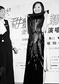 昨天,在西单一家KTV举办的《甜蜜蜜——邓丽君金曲交响演唱会》的发布会上,张靓颖、羽·泉以及黑鸭子组合悉数出场,来为这台定于5月4日和5日举办的演唱会造势。整整让记者苦等了一个小时之后,几位主要人物才陆续登场,照例是张靓颖的歌迷最为疯狂,他们不仅穿着印有张靓颖照片的背心,还佩戴着统一的蓝色围巾,手里还狂挥着塑料小海豚。