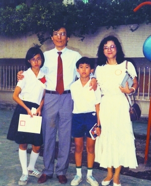 与爸爸、妈妈、弟弟合照的范玮琪(左一)闷闷不乐
