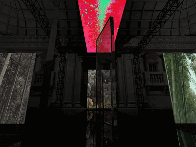 现场矩阵排列的镜片犹如置于旧世纪剧场的木地板,变成异世界存留的遗物,随时等待被唤醒。此时不同的镜片指引着声音的时空裂痕,随着笛声演变,开始出现扭转现实与虚拟的颜色和影像,如时间的记忆碎片,所有元素都焕发有机的音律视觉,开启异空间的大门,自然矩阵也寻声而至。