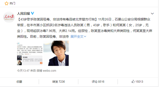 今天下午,石景山公安分局微博发布消息称,根据群众举报,在本市某小区抓获2名涉毒违法人员陈某(男,43岁,歌手)和何某某(女,25岁,无业),现场起获冰毒7.96克、大麻2.14克。经尿检,陈某呈冰毒类和大麻类阳性,何某某呈大麻类阳性。目前,陈某因吸毒、非法持有毒品,何某某因吸毒均被行政拘留。