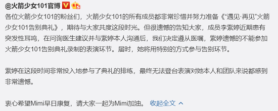 尽管依靠腾讯的强势,火箭少女101从出道至解散仍然保持了11人完整体,但昨晚的告别典礼却只有10个人,两天前,组合官博告知观众成员李紫婷因突发性耳鸣将缺席告别典礼,在这之前李紫婷便发布了正在输液的照片。成员忽然病倒缺席告别典礼也招致了粉丝不满,对组合运营公司哇唧唧哇和背后的腾讯“血汗工厂”的指控占据了火箭少女饭圈的主流声音。尤其是临近解散还被指派参加同公司师弟团r1se参与的《炙热的我们》,更让粉丝们质疑公司压榨火箭少女以扶持r1se。