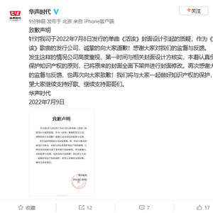 新浪娱乐讯 7月9日,华声时代官博发文道歉,称“针对我司于2022年7月8日发行的单曲《活该》封面设计引起的质疑,作为《活该》歌曲的发行公司,诚挚的向大家道歉!感谢大家对我们的监督与反馈。发生这样的情况公司高度重视,第一时间与相关封面设计方核实,本着认真负责保护知识产权的原则,已将原来的封面全面下架并进行封面修改。再次感谢大家的监督与反馈,也再次向大家致歉!我们将与大家一起做好知识产权的保护,希望大家继续支持好歌、继续支持哥哥们。”