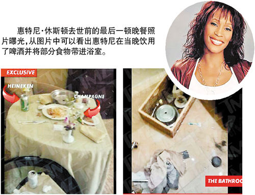 此外,惠特尼·休斯顿去世前的最后一顿晚餐照片曝光,从图片中可以看出惠特尼在当晚饮用了啤酒并将部分食物带进浴室打算洗澡后享用。可以清楚地看到,惠特尼在晚上所点的食物及饮料有:汉堡、炸薯条、火鸡三明治和墨西哥辣椒。图中还可以看到一罐啤酒和一个空的香槟酒杯,据称这个香槟酒杯此前盛满了香槟。