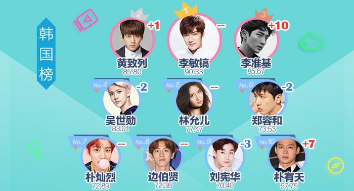 韩国榜本期前三分别李敏镐、黄致列、李准基。