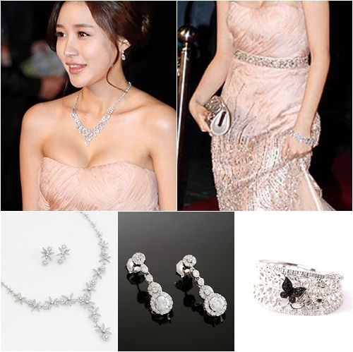 浅淡的粉红色礼服以珠子装饰提升了优雅的气息,而细密的钻石抢眼球的淑女风项链尽显华丽。耳饰比较简约,用项链和手链添重点,令尹真伊成为当天最华丽的女演员。