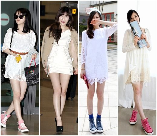 首先让我们悉数Girl's Day敏雅的着装风格吧!蕾丝材质的白色连衣裙既kitsch又淑女,腰部佩戴的褐色皮革腰带凸显经典气氛,同时搭配的帆布鞋还增添了舒适感。