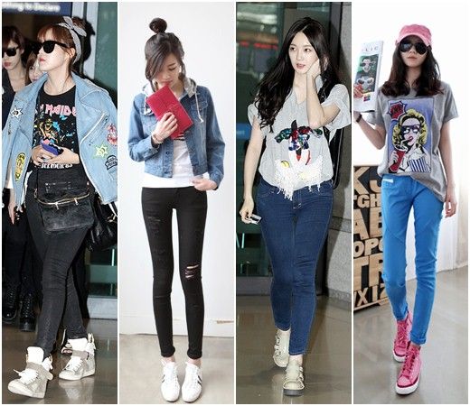 弥漫朋克气息的休闲装也是机场上的流行风格,机场上大展朋克范儿的明星则是T-ara孝敏和Davichi姜敏京。
