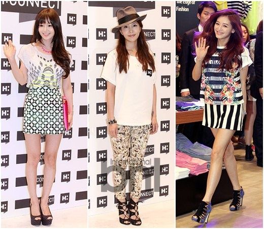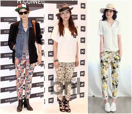 韩星金娜英和歌手宝儿都穿了彰显清新感的花裤,金娜英在牛仔夹克上叠搭黑色小西服,并以花裤和大款包包大展朋克休闲风格。相反,搭配基本T恤强调花裤的宝儿,佩戴绅士帽展现了自由奔放的一面。