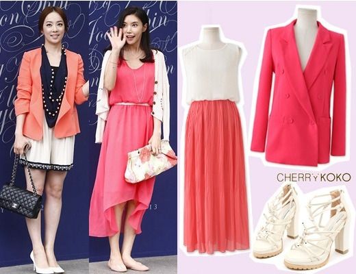 朴恩英一身醒目亮眼的橘色夹克搭配白色雪纺裙,充满了成熟清甜的女人味,整体的造型让人善心悦目。而吴承贤一身粉红色轻薄长裙,外搭休闲利落的白色针织开衫,尽显浪漫的夏日风采。