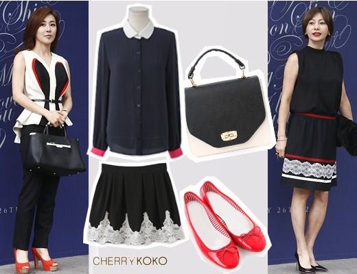 文正熙一身peplum设计的黑白无袖衫搭配黑色职场裤,脚穿吸睛力较强的红色高跟鞋,展现出无比的干练魅力。尤其是以收腰细腰带强调了纤细的腰部曲线,整体的造型充满了都市摩登魅力。