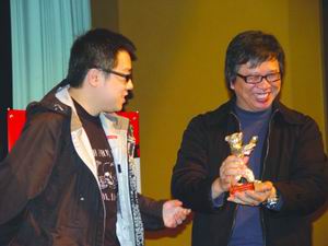 为配合第13届大学生电影节“华语电影全国高校巡展”的启动,香港导演彭浩翔和刚刚在柏林电影节上拿下“最佳电影音乐银熊奖”的金培达于昨日(7日)在北京三所高校亮相。在主持人的要求之下,金培达在讲台上手捧“银熊”,这酷似得奖瞬间的一幕引来了全场的热烈掌声。