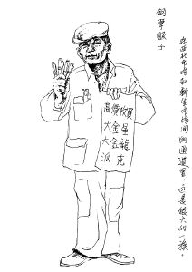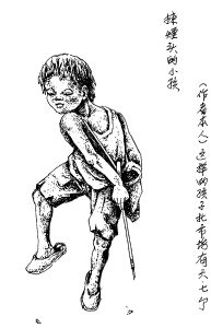 霍夫告诉记者,他是从1949年到的北市场,1954年离开的,当时以捡烟头为生的他对这几年的北市场的三教九流都非常熟悉,他要画的这100个人当中不一定都是有名有姓的人,但是却代表了北市场当时的一个阶层或者说一个行当。记者看到霍先生画的第一个人物是一个“捡烟头的小孩”,蓬头垢面、衣衫褴褛,斜挎一个布袋子拿着一个绑着针尖的竹竿。霍老说,这个小孩就是他自己,当年在北市场像他这样的孩子有六七个,都是靠捡烟头卖烟丝为生,因为捡烟头的地方都是戏园子或茶园子
