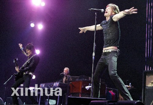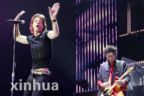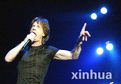 4月8日,滚石乐队主唱贾格尔(右一)在演唱《超速》。当日, 传奇摇滚乐队――滚石乐队“石破天惊”世界巡演中国站演唱会在上海首演。2005年8月,滚石乐队世界巡演从美国波士顿启程,已在北美和南美演唱会上创造了一系列的票房奇迹。 新华社发 记者陈飞摄
