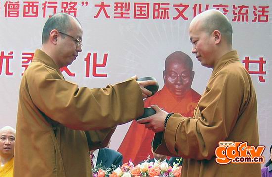 在“重走唐僧西行路”启动仪式上,大陆的明贤法师和台湾的慧宽法师,作为本次西行的“新唐僧”首次公开亮相。大陆的明贤法师带来了采自黄河壶口瀑布的水和取自黄帝陵的土;而台湾的慧宽法师则带来了采自日月潭的水和取自阿里山的土。这两份从千里之外带到广州的水土在现场融为一体,意喻着海峡两岸水土交融,携手发展的合作愿景。