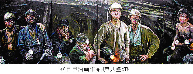 这是一幅近年来难得一见的现实主义油画作品,长5.5米、高1.8米,表现了在地下几百米深矿井里采煤的矿工们走出矿井的瞬间:脸上粘满厚厚的黑煤,只露出一双闪闪发光的眼睛和洁白的牙齿,黑暗中唯有一盏带来光明的矿灯耀眼照人。画中7人、8盏灯(一位已在矿难中去世)。张自申站在他刚刚完成的作品前,思绪仿佛又回到了在井下生活体验的日子,“画每一个人,我的心潮都久久不能平静。因而在画的前言上写道‘献给读者和中国矿工及矿难中死去的弟兄们!’”