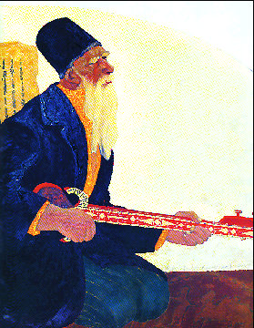 肖谷是个有激情、有想象力的画家,他在挂职于新疆阿克苏地区艺术学校副校长期间,创作出大量反映天山南北、尤其是南疆风土人情的油画作品,使人耳目一新。在表现技法上,他运用他称之为“克孜尔尕哈沙”的当地一种细腻的沙粒,生动表现了南疆干燥的大陆性气候特征和独特的精神状态,让人们领略到他创作的个性与敏锐的观察力。左图为肖谷西域油画《弥勒会见记》