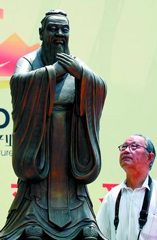 6月18日,在济南举行的山东国际文化产业博览会上,一名老者仰看孔子标准像雕塑。中国孔子基金会于6月13日在济南向海内外正式发布了孔子标准像雕塑(初稿),以征集反馈意见。定稿后的孔子标准像将于今年9月在孔子诞辰2557年的祭孔大典上正式向全球发布。 新华社发吕传泉 摄