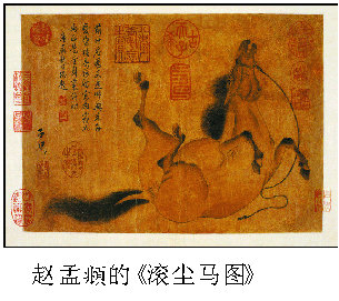 元赵孟(兆页)是中国绘画史上的传奇人物,现存的作品几乎都是由博物馆收藏,很少在拍卖市场露面。这次预展的《滚尘马图》是赵孟(兆页)的重要鞍马作品之一,绘的是就地打滚的马,700多年来逗乐了无数人,也深得乾隆的欢心。他阅后欣然提笔,在画上赋诗一首:“前世应为支遁师,兴来每爱写权奇。何妨窗内窥如马,正是全身里许时。”
