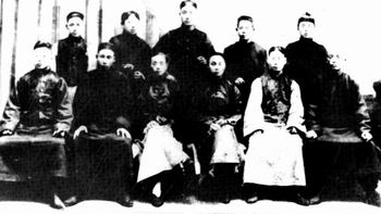 上图为1921年越剧男班艺人合影。金水荣(前排左一)先后四次,历时三年终以《梁祝》等剧目打入上海滩。其后男班逐渐被女班顶替,下图为1947年袁雪芬(前排左三)等十位越剧名角在上海义演改编自大仲马小说《三个火枪手》的文明新戏《山河恋》之后的合影