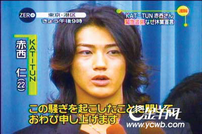 日前,日本最当红的团体KAT-TUN的成员赤西仁突然毫无预警地举行记者会,宣布自己要到国外念书半年,归队时间未定。而他所在的经纪公司杰尼斯则发表声明,指未来KAT-TUN会以五人姿态继续发展,请歌迷们谅解并支持赤西仁的决定。在KAT-TUN演艺事业如日中天的时候,赤西仁暂停演艺工作消息传出后,让许多忠实粉丝闻之心碎。日本媒体大幅度报道并质疑“留学”的说法,绯闻太多被冷冻、上节目走神等传言也陆续浮出水面,各界揣测不断。