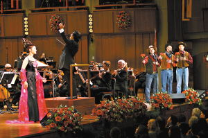 当天,美国这个最高雅表演艺术中心被阵阵掌声激荡,中国著名歌唱家宋祖英以一首深受美国观众喜爱的“好一朵美丽的茉莉花”开头,一口气演唱了十二首中国民族歌曲,最后在全场热烈的气氛中以《爱我中华》圆满结束。