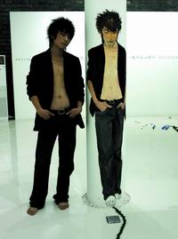 至于墙和柱子之间的多米诺,观众们只能看到它们摊倒在地的景象。在开幕式前一天,作为模特的年轻人亲自动脚,把自己花了一个下午,耗尽移山心力才摆好的骨牌踢倒。骨牌哗啦哗啦地倒着,年轻人嘻嘻哈哈地笑着,而三个老男人心照不宣地看着这一幕,显得那么“居心叵测”。