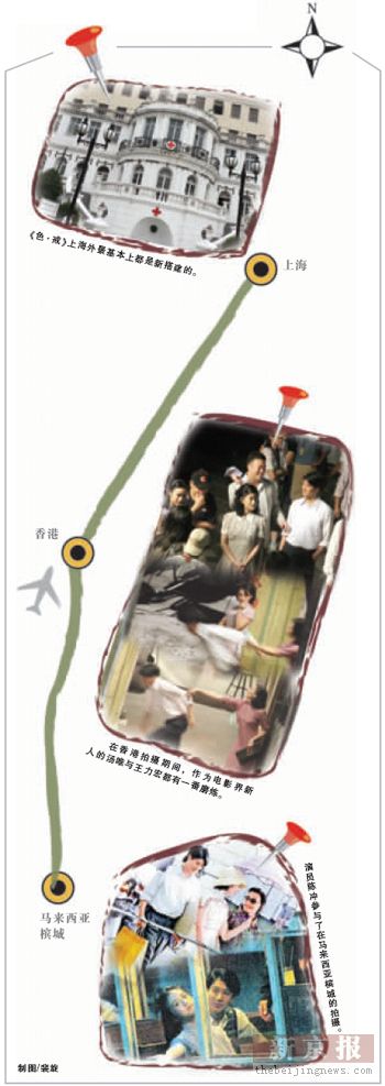 《色·戒》剧组除耗资2000元在万车墩影视基地搭建“南京东路”外,还选定了重庆公寓作为“王佳芝”的寓所,另外上海南汇新场镇以及几所高校,都成为“学生戏”和培养特务戏的拍摄地。
