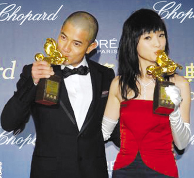 金马影帝郭富城影后周迅亲吻奖杯