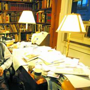 老式电梯一直通向五楼。这是一套书籍拥塞的公寓,从过道开始,室内的每一个墙面都被放满了书的书架所占据,书房里的两张书桌上报刊书籍更是堆积如山。桌上的不少出版物是国内寄去的,“我这里有《书城》,上面有我的文章。”夏志清随手拿起一本杂志这样说道。