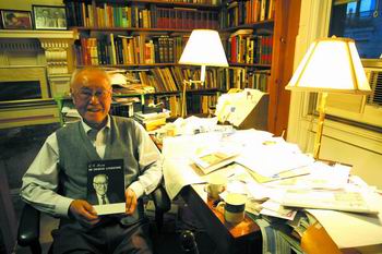 夏志清在纽约寓所的书房中,捧在手中的是集夏志清学术成果大成的英文版《中国文学论集》。王寅/摄