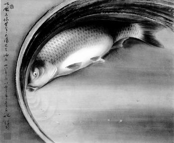 盘鱼,1948年,65×70cm款识:以国画临摹太阳先生油画四八年写八零年冬再记绿野