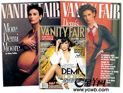 1991年,黛米·摩尔在《名利场》杂志封面上的大肚子裸照至今让人们记忆犹新,一年之后,她又出现在《名利场》的封面,用彩绘在裸体上欲盖弥彰地画了一套西服。近日她再次出现在《名利场》的封面上———这次她终于穿上了衣服。