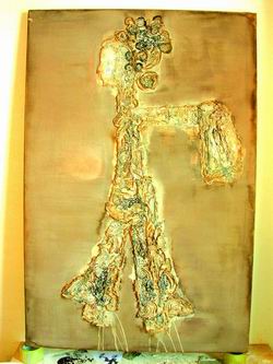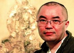 “茶画”则相对单纯得多。冷冰川把画布用茶水浸泡染色,几十遍几百遍,类似于中国画的“做旧”;再把掺杂了茶叶渣、中药渣、碎麻布等材料的油画颜料涂在画布上,凭一时灵感,随心所欲。“人有优美的一面,也有破坏性、发泄的一面。这个就是动作性比较大,有1米5长的,不可能坐在那里描,需要我有即兴判断。”画“茶画”的时候,冷冰川站着,有大动作大手势,正好与画黑白画时的情形相反。
