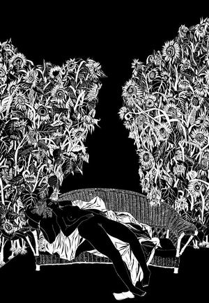 画面上,丰腴的裸体女人慵懒地躺在沙发椅上,两旁是疯狂、扭曲的向日葵,向日葵似乎还在不停伸长,要把女人湮没。