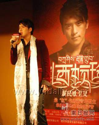 经过数月的秘密打造,云南“好男儿”扎西顿珠个人首张同名专辑《扎西顿珠》终于揭开神秘面纱。在昨天北京举行的新闻发布会上,扎西的母亲、云南著名藏族女高音歌唱家宗庸卓玛和“稀饭”们,不仅为扎西送上了寓意为雪藏之鹰的鹰雕及一碗新鲜的稀饭,更现场献唱了一曲由“稀饭”作词、宗庸卓玛作曲的歌曲。