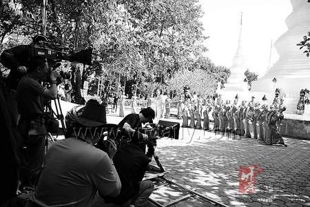 下午3点30分,摄制组停止了泼水广场的拍摄,开始移到景区的“塔包树”景点,先由从少林寺来的7名6岁大小的僧人,在一棵千年古树下表演少林拳,随后又有两名全身文满图案的傣族老波涛(傣语:老大爹)表演了一套傣拳。