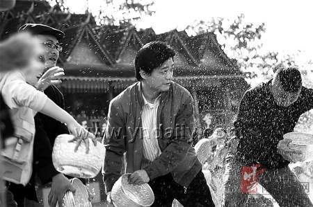 1点30分,傣族园景区和西双版纳州民族歌舞团的百名傣家少女,开始穿着鲜艳的傣装进入泼水广场,与崔永元等5人进行泼水表演拍摄。崔永元与另外两男一女3名演员由于还要进行后面的节目拍摄,在泼水中成了重点保护对象,不许将水泼到他们身上。4人手抬银钵在泼水人群中悠闲地转来转去,偶尔有水珠溅到脸上,化妆师都要迅速上前给他们擦干补上妆,然后再接着拍摄。相对崔永元来说,那名全身黝黑的外籍演员就惨多了,在整个泼水拍摄的两个多小时里,100余名傣家少女一直抬着圣水对着这名老外狂泼,很有无处躲藏的意思。
