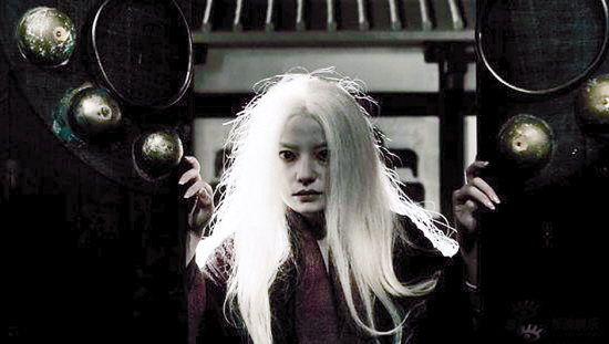 赵薇在影片后部因为中毒而成了“妖”。那个造型很多人说像“白发魔女”,其实我觉得不是。我是想体现出她被迫成妖的感觉,所以她的白色假发不会像洗发水广告里那么油亮润滑,而且脸色苍白,眼神有点散乱和慌张。我给她专门配了一副墨绿色的隐形眼镜,因为赵薇平时的眼睛太大,太黑白分明。赵薇戏里流出的血泪,是我到眼科医生那里专门配置的加色眼药水。