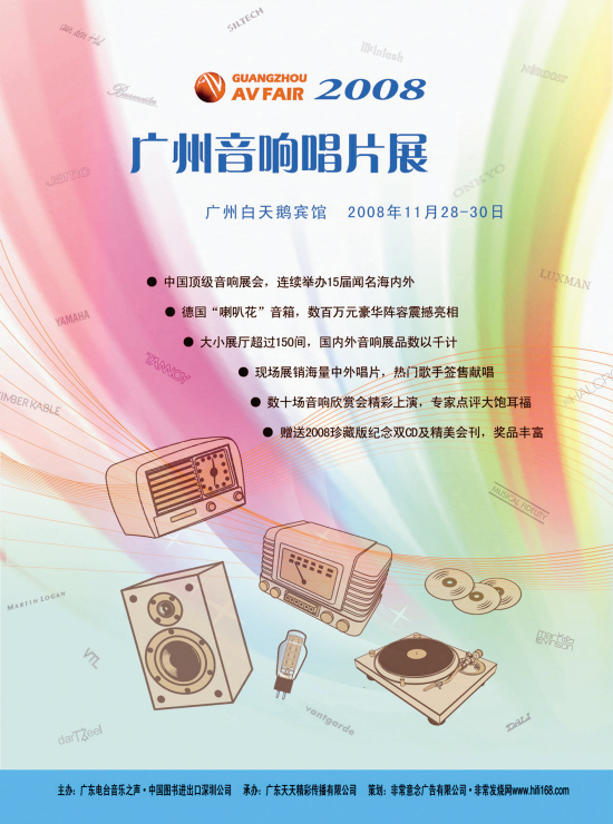 由广东电台音乐之声主办的“2008广州音响唱片展”定于2008年11月28日至30日在广州白天鹅宾馆举行。本次唱片展有129家国内外公司参展,大小展厅140多个,展出音响和家庭影院器材及CD、DVD等音响制品多达数千种。目前这个每年仅举行三天的展会已成为音响界一年一度的盛会,甚至引起诸多国际品牌的极大关注。