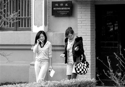 和之前进德语系办公楼时严肃的神情相比,王亭亭(左)出办公楼时的表情明显轻松了很多。