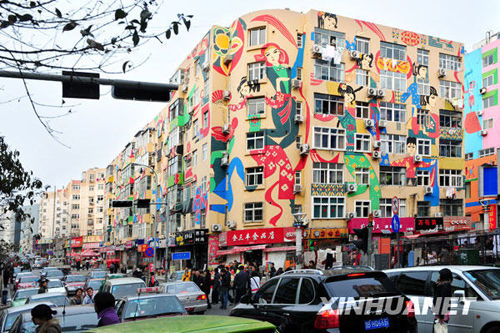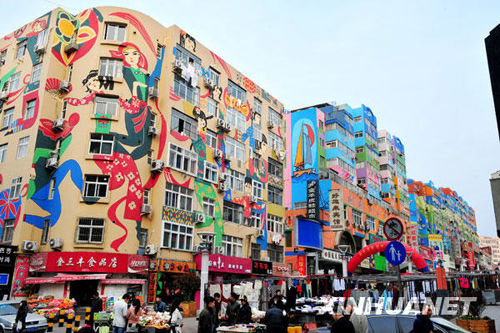 新华网4月8日报道青岛台东三路步行街两侧20多栋临街楼体上绘着4万多平方米的楼群壁画,包括民俗图案、海洋装饰、时尚元素、戏曲脸谱等不同主题,鲜丽悦目的墙体使整个步行街显得个性十足。