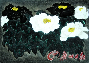 版画《黑牡丹白牡丹》(郑爽作)
