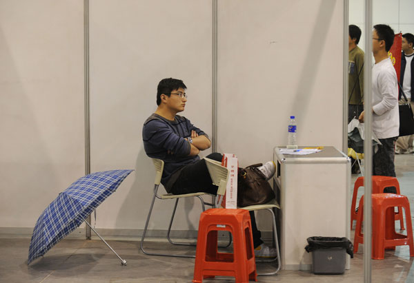 2009年5月16日,安徽合肥国际会展中心大型招聘会现场,招聘单位工作人员无精打采。