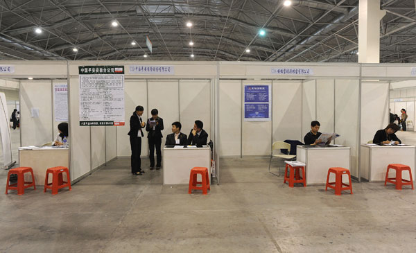 2009年5月16日,安徽合肥国际会展中心大型招聘会现场,招聘单位的工作人员在等待应聘者到来。