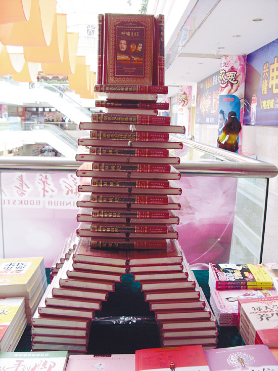 本报讯(记者 盖云飞)长度5米,高近1米的超级书塔BOOK造型,近日在兴隆大家庭三楼完美呈现。据悉,这是沈阳市新华书店在举办2009精品图书创意书展。书展工作人员告诉记者,这个超级书塔造型,是用《浮沉》和《标准日本语》两种图书搭建的,共4名员工参与,用时不到1个小时,总计用书582本。另外,记者在现场还看到巴黎埃菲尔铁塔造型的书塔、红色五角星、如动感光波般水纹书塔等,个个独特新颖,构思巧妙,让记者不无感叹,原来用图书也能垒起这么好看的造型。书展上方悬挂着各种玩偶,小沈阳、灰太狼、喜羊羊、蜡笔小新等。