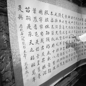 本次展览颇具特色的一点是,以身为刘邦后裔而自豪的刘艺,在此次书画展的主题上也以选择涉及刘邦的文字和诗歌为创作主题。其中包括李白、杜甫和唐寅的诗意画,还有诗人杜牧的千古名篇《阿房宫赋》。作品布置在会馆二楼宴会厅的一侧,刘艺指着一行行书法,对记者念道:“六王毕,四海一。蜀山兀,阿房出……”厅内另一头,则贴着刘艺的行书作品、节选自班固《汉书》中描写刘邦部分的文字。他还告诉记者,自己不久前刚刚在日本东京举行了书画展览。据悉,此次展览将持续约一周时间。